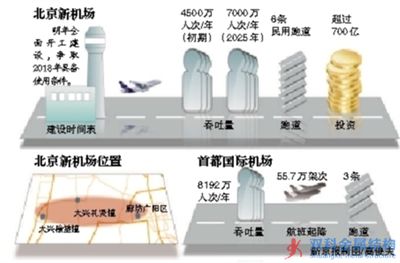 北京新機場(即首都第二機場)明年全面開建 力爭2018年完工;共有6條民用跑道;機場工程投入超700億元