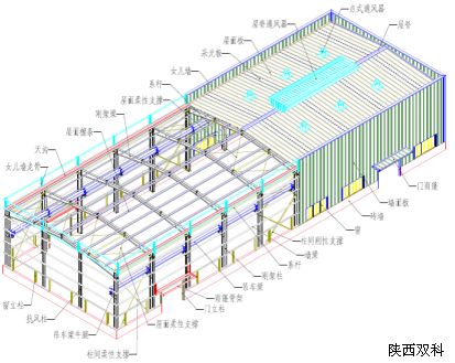 2、屋蓋構件吊裝,及時進行固定并按好屋面支撐系統(tǒng),以保持結構穩(wěn)定。