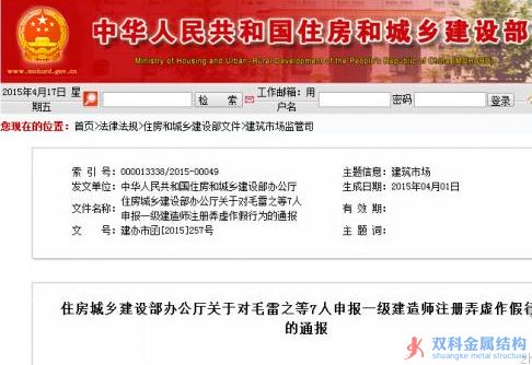 ![]() 4月16日,住房城鄉建設部辦公廳官方網站發布建辦市函[2015]257號文,對毛雷之等7人申報一級建造師注冊弄虛作假行為處罰的通報。 建辦市函[2015]257號 各省、自治區住房城鄉建設廳,直轄市建委,新疆生產建設兵團建設局,國務院有關部門建設司(局),總后基建營房部工程管理局: 我部在一級建造師注冊審查時發現,江蘇新業達基礎工程有限公司毛雷之、蘇州陳氏建設工程有限公司張甫勛、杭州先高路橋工程有限公司曾慶賀、重慶電力建設總公司鄭光全、昆明一建建設集團有限公司鄭文、云南省第二安裝工程公司虞奇志存在隱瞞其注冊監理工程師已注冊在其他單位的事實,提供虛假材料申請注冊的違規行為;廣安市立新建設工程有限公司葛瓊存在以出租、出借形式轉讓資格證書的違規行為。為加強注冊執業管理,根據《注冊建造師管理規定》(建設部令第153號)的有關規定,現對毛雷之等7人給予通報批評,一年內不受理其注冊申請,并將其不良行為在全國建筑市場監管與誠信信息發布平臺上予以公布,記入信用檔案。 |
